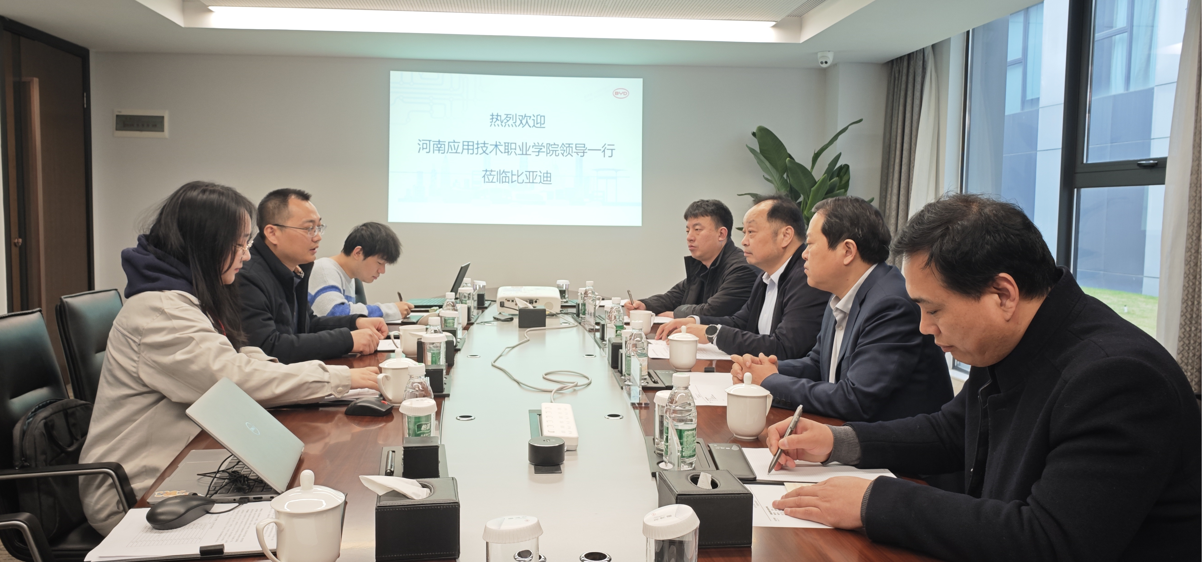 3月7日,校长薄新党,副校长常新中,院长办公室及米乐mile体育官网负责人一行4人赴深圳比亚迪股份有限公司调研交流。比亚迪股份有限公司人力资源处校企合作经理杨双喜及相关业务负责人热情接待并出席座谈会。