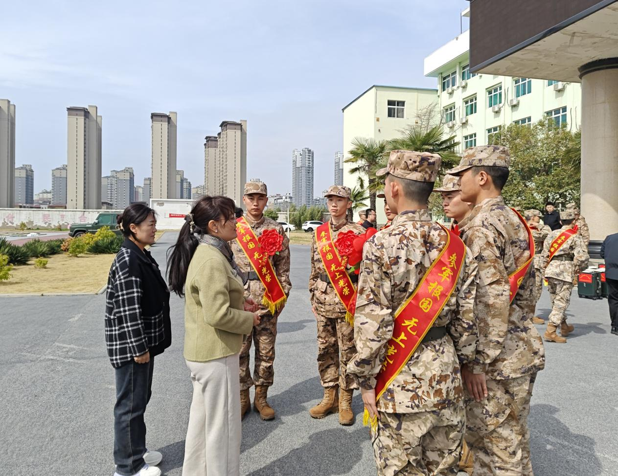 活动伊始,老师们对即将踏入军旅生涯的学生表达了最诚挚的祝贺,言辞中满是对他们的殷切期望,强调在部队中务必严格自律,全身心投入艰苦训练,在部队大熔炉里不断锤炼,实现人生价值的飞跃。学校精心准备了具有纪念意义的礼物,这些礼物承载着对入伍学生的深切关怀与美好祝愿。老师们亲自将礼物递到学生手中,每一次交接都伴随着温暖的叮嘱与鼓励,传递着师生间深厚的情谊。随后,老师们细致地为学生整理象征光荣使命的绶带,那认真专注的神情,仿佛在为即将出征的战士整理戎装,绶带随风轻扬,象征着学生们即将开启荣耀的征程。